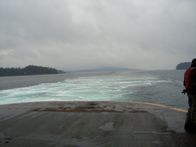 まあ、今日は許そ〜。明日晴れてくれたら、だけど、天気予報によると、ざあざあ降り。これだけは外れてほしい。去年ぶりのビクトリアだ。去年はハーフマラソンに参加。だけど、この時も雨。本来なら、ランクラブの人と一緒に車で行くはずが、彼Wは他人の狭い車がダメ・・・なぜなら、ずーたいがデカイから、足が伸ばす所がない・・・まあ着いて来てくれるんだから、この辺は聞いておいた。で、フェリーからエクスプレスバスへ乗る。そこで、車が出て行くデック2へ。めちゃめちゃ寒い。しかも、この写真のグレイさ・・・もう少しで、バンクーバーアイランドへ上陸。
