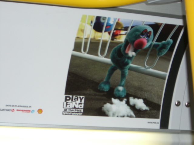 と思いますが。来た当時にも行きましたが、この頃は若かったので、アンダーエイジ16歳以下で入っちゃいました。う〜ん、アジア人の特権。若く見える!!それに多分年の感覚が見ても分かんないんでしょうね。それはさておき、前にもブログにバスにあった広告載せたのですが、新しいのを発見しました。今度はイヌバージョンですね。この切なげなぬいぐるみ (こちらではStuffed Animal と言います)が綿を吐いている姿は何ともいえないものがあるのですが、それは私だけでしょうか?乗り物に乗り過ぎて気持ち悪くなっちゃったんでしょうね。Burfing out the gutsって言ってたの覚えてますか?人間じゃないので、綿になっちゃうへんも私は笑えるんですけどね・・・ とりあえず、今のところ3バージョン見っけ!
