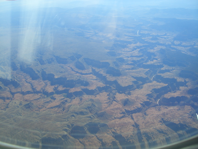 で、飛行機からグランドキャニオンが見えた!ラッキ〜!!すっげ〜でかい規模で、びっくりした。機会があったら行ってみたいな、やはり。やっぱり飛行機からだとあまり写真はよく撮れなかったけど、こんな感じ。