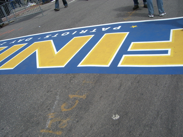 呼吸よりも何よりも、足にくる。上り坂では何度も歩きたい衝動に駆られたが、何とか乗り切った。これが終われば下り坂だよ〜と言ってくれる。あと4マイルちょっと。これが長かった。もうこの辺りでは、時間を計算する余裕もなかったが、明らかにペースが落ちているのが分かった。ボストンカレッジの学生、早稲田の学生みたいにエンジのスクールカラーのフード来てすっごい応援してくれている。それに多分酔っぱらっている学生も多々。ありがとうなんていう余裕もなくなって、ただただ前に前に行くだけ。この辺りから、給水所でしきりにドリンクを取るようになった。気分転換。それに冷たいのが美味しく感じる。あれ?もう下りだけじゃななかったのか。。。ちょっとした上り坂も大きく見え、苦痛を感じる。そして、あのストリートカー。確かフィニッシュに近づいているはず。あっ、ビデオで見た。遠く彼方にCITGOのマークが。もう少し。しかし、40キロからが長かった。かなりペースが落ちているのが分かるが、もう足が固くて棒のよう。この辺はどんどん抜かれていく。だけど、足が動かない。そして、あの噂のトンネルがやってくる。うわ〜、また上り坂。普段だったら、そこまで苦にならないだろう。足をはうように上って行く。もう少し。沿道の人も増したようだ。そうして、角を曲がったら、Boylston St. 青いフィニッシュラインが見えた。フィニッシュラインが揺れる。直線で近いように感じるがとっても長い。最後にスパートをする人たちがどんどん抜かして行った。いろいろ飲んだせいか、呼吸はさほど苦しいように思えない。だけど、太ももがかちかちで、スパートもできない。あ〜、長かった。きゃ〜、ゴール