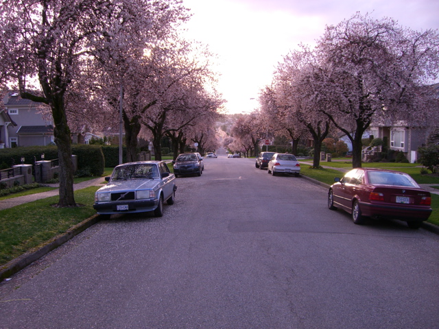 (娘さんの迎えにいくとか)これから、バスで乗り継いで帰るのはちょっと気が遠い。。。結構みんな歩き方が変な感じ。しかし、本番のレースはこれより10キロ長い。大丈夫なんだろうかというのが、初マラソン組の頭をよぎるが。。。これ以上考えないことにしよう!ということで、他の桜並木も撮ってみましたよ。まだ満開ではないけど、雨にも負けず咲き続ける桜たち。バンクーバーの桜はきっとタフ。