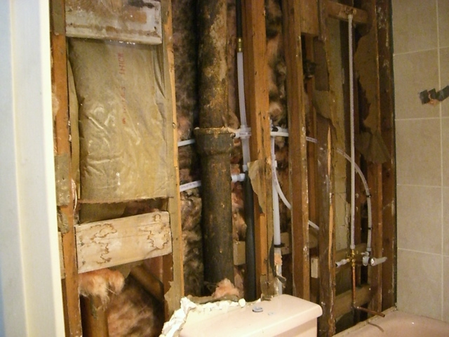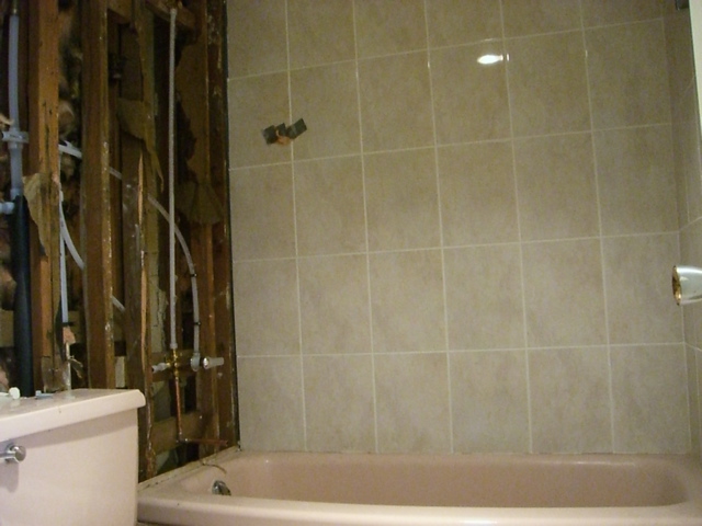 あ〜、水道工事の途中経過です。工事自体は終わりで、シャワーは昨日から使えるのですが、まだバスルームができあがってないんです