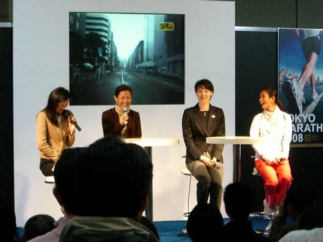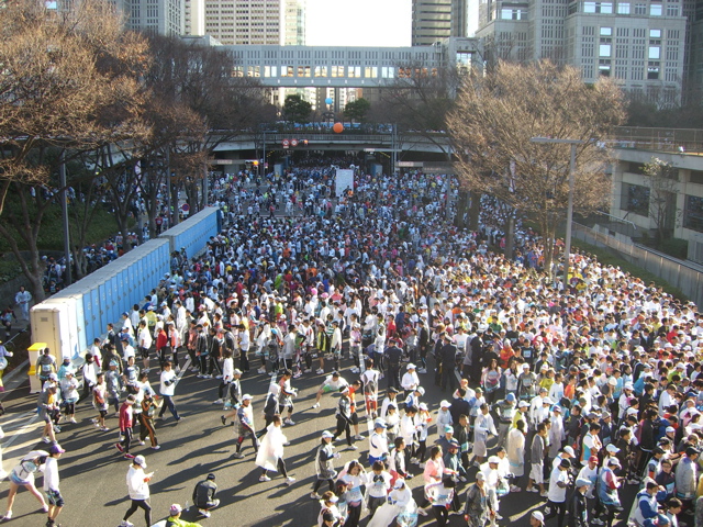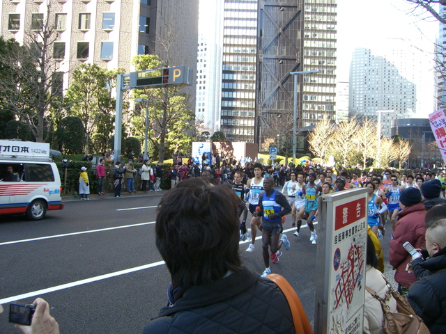 やっちゃった。仕方なく自分の水でちょっと洗ってみるけどいまいちきれいにならない。しかも、後で自分のペースで水が飲みたい時に全く水が飲めないのも嫌なのでと思い、セーブする。拭き取るものは?うっ、帽子ぐらいしかないな。げっ、しかも今さっき給水所通り過ぎたばかりだな〜。仕方がない。次の所まで待つか・・・お陰さまで、手袋は抜いでいてよかった。ベタベタした手をしたまま、走っていると浅利純子選手がいた。えっ、こんなところ?にフツーに走っている〜!!うわ〜とミーハー丸出しで通り過ぎて行った。ようやく15キロ辺りへ来る。あれ〜、まだ〜、給水所。品川で折り返してようやく給水所が。アミノバリュー・・・さすがにこれは手にかけても余計にベタベタになりそ〜。そして、きゃ〜お水!手にかけて洗う。ボランティアの人は、この人何してるの?って思ったに違いない。バリバリになる前に洗えてよかったよ。折り返して行くと、いろんな人が見えて面白い。が、あれ〜?右腿の裏が固くなってきた気がする。おいおい、まだ15キロ過ぎたばっかりだよ。ここで痛くなったら最後まで持たないかもな〜と不安がよぎる。この後、調子が悪くなれば、頭を切り替えるしかないが。ペースは先程よりはよいが、3時間40分、38分ペースよりは2分ぐらい遅れている。はっ気が付くと、3時間40分ペースバンドはどこかに行ってしまい、38分のだけ残っていた。まあ、いいや。ある程度の時間が分かればよい。結果的にはこれがよかったのかもしれない、38分に焦点をあてれたので。そうしていると、浅井えり子っていうゼッケンが見えた。前を走っていた男の人は先回りして振り返って挨拶していったのを見たので、うわ〜、私も勇気を振り絞って、「こんにちは、浅井えり子さん!」って言ってみたら、ちゃんと挨拶してくださった。はっきりと何を言われたのか分からなかったのですが、「ガンバって」といった内容のようなものだったと思う。たくさんのランナーがこれだけいて、相づちしていたら大変だと思うけど、さすが。いや〜、さすが東京マラソン。こういったランナーと一緒に走れるのって涙が出るくらい嬉しいよね