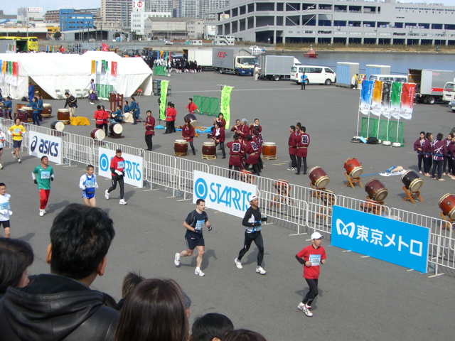 この辺からは結構給水所に寄ることが多くなった。気分転換になる。沿道でいろんな食べ物を配っている人がいる。中には鶏肉とかあったよ〜な気がする。私はよく分かんないけど、チョコスナックをもらった。こうやって沿道の人は準備をして応援しているのはほんと有り難い。あとは本当にカウントダウンして走って行く。銀座に来たら、海の方向へ。いつ橋が来るのかな待っている所である。35キロを通過した後で、ちょっと上りの坂が。期待していただけに、終わってよかったと思いきや、またあるの?結構思ったよりアップダウンがあるよね。そんな最後にとっておかなくても・・・ここからは、給水所が目的になる。欲しいと思わなくても、アミノバリューか水をとっていた。最後の橋を渡る前にチョコレートを渡している家族がいた。小さい男の子からはもらえず、お父さんらしき人からもらった。結構しんどくてすぐに食べれなかった。口に入れてしばらく時間をかけて食べた。ここで3つの橋があるとは思わなかった。きつかったので、沿道にいたたくさんの人とハイファイブをしながら走った。これって、結構元気が出る。40キロ。時間的には結構悪くなさそう。後2キロ。もう近いのが分かる。フィニッシュはどこだ?回ったら太鼓の音やスタンドのあるゴール地点が見えて来た。