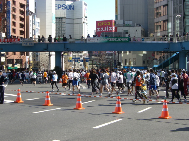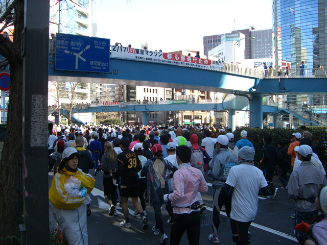 さてさて、新宿から出る頃には、レインコートは脱ぎ捨て、暑くなるかなという感じがしてきた。まだまだ人がいっぱいいて、端っこから抜かすのも結構大変。しかも、端っこだったら、ここからトイレに入る人が時々急に止まるから危ないとも思い始めた。しかし、噂通り、ほんとに下り坂だ。オーバーペースに注意って書いてあったけど、オーバーペースも何も人で速く走れないよね。思ったより風があって、例のカナダ帽子は髪の毛を結んで穴から出しているにも関わらず、帽子が浅いため何度も脱げそうになる。もらったものだしな〜、捨てるのはもったいないな〜と貧乏性