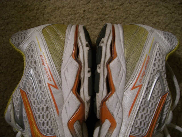 最初は筋肉痛かなと思っていたので、少し使った方が楽になるかな〜と思った。特に右側の足の裏、特に外側の後ろ側が痛かった。次の日は歩き回っていたけど、とっても変な歩き方だったろう。しかも、レースとは同じではないが、ランニングシューズをずっと履くはめになる。今までレース後でも足の裏は痛くなったことはない。これは最近気付いたんだけど、右側の外側のヒールが左側と比べて断然つぶれているのが分かるかな?実際見るともっとよく分かるんだけど。もっと新しいシューズでレースをするべきだった。こんなにクッションがなくなっているとは思わなかった。MIZUNOのウェイブエアロ、ライトウェイト、トレーニングシューズ。レーシングフラットではないが、Orthoticsという矯正用のオーダーメイドのインソールを入れてから、レースにはある程度軽いもので臨むようにした。というのも、なんと言ってもOrthoticsを入れると靴がとっても重くなる。トレーニングはあまりこのシューズではしていなかったものの、(私が悪いんだけど)、マラソン2つ、ハーフ1つ、駅伝のレースもこれでしてしまったので、レースに使い過ぎたようだ