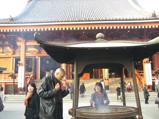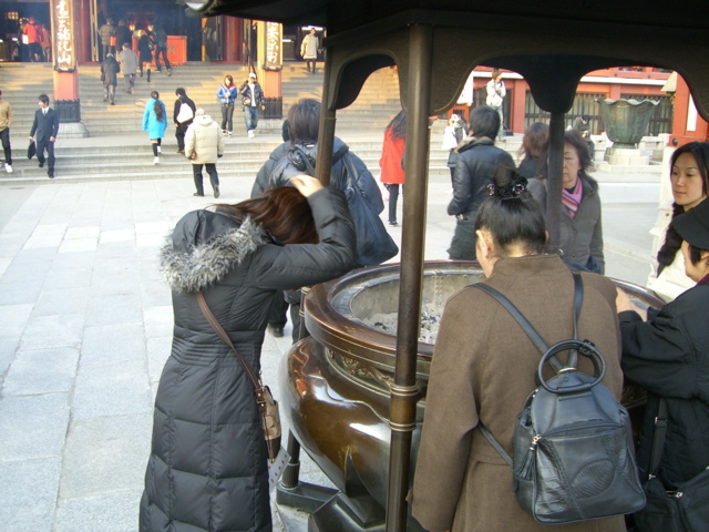 お決まりの浅草寺の前で、煙をかける。そうおばさんはWの行動を一生懸命見ているよね。もう一人の女の人、めっちゃカメラ目線。私が彼を写真撮っているのが気になったのかしらないけど・・・