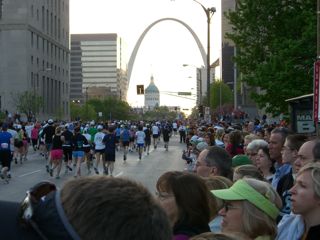 ダウンタウンのアーチに向かってのスタートライン出発。今回は全くと言っていいほど練習できていないので、ほとんどぶっつけ本番という感じ。特にロングランが走れていない。なので、期待はせず、ゆっくりめにといい聞かせる。特にハーフの人と一緒だとスピードが違う。ダウンタウンをぐるりと、あのバドワイザーのビールで有名なアンハイザーブッシュスタジアムやビールの工場前を通る。ダウンタウンは普段なら寂れていて、あまり普段なら行きたくない場所だが、この日ばかりはランナーでいっぱいで全然平気だ。ペースはキロ5分20、30秒ぐらい。速くないけど、こんなもんか。まだ体が眠いし、先が長い。まあ、ここはマイル表示です。しかも小さい割にはちゃんととけりがマイルごとに設置してある。セントルイスのコースはちょこちょこと坂のアップダウンがある。まあ、退屈はしないけど、最後のあたりはこれが堪えるね。