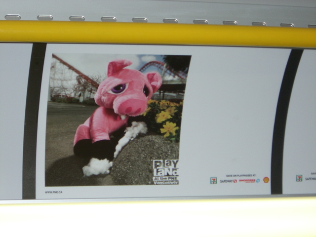 いやあ、今年のPNEの広告は工夫ありで面白い。といいつつ、前の広告覚えてないけど・・・PNEって何?ってお考えの人・・・ Pacific National Exhibitionという略で、今は遊園地がある場所としてバンクーバーでは知られています。ですが、遊園地が開いているのは、夏の期間だけです。興味のある人はこちらの青いマークをクリック。■■■ http://www.pne.ca/ 日本の遊園地に比べればもちろんかなり規模は小さいのですが、子どもたちやここで育った人は馴染み深い所なのです。しかし、私が行ったのは何年前でしょう???一日で同じ乗り物を3回ぐらい乗れちゃいますよね。ジェットコースターはある別の意味で怖かった・・・首にサポートがなく、首がこるし、音がすると壊れる?って思っちゃいましたが、行かれる方はちゃんと整備されているので、大丈夫ですよん。