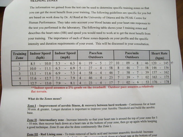 で、今週の月曜日にコンサルタントに出かけました。コンサルトしてくれるのは、このセンターのマネージャー、マイク。またホワイトボードに図を書いてくれました。基本的には心拍数、酸素量、血液から採れた乳酸の量から、個々人のゾーン1〜5が決定。ゾーン1は、有酸素運動を効果的にできる領域(Aerobic Thresholdと言います)ゾーン3は、無酸素運動になる域、そして乳酸が急激に貯まっていくゾーンらしい。(ゾーン3の真ん中をLactate Threshold、もしくはAnaerobic Thresholdと言います)ゾーン5は最大量に近い運動をする域なんです。すっごい個人的な私の表ですが、これが私のゾーン1から5です。(きっと見えないよね