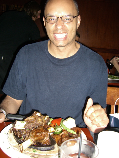 が分かって頂けるかと、はい。ちなみに「しし」座だもんね。このプレートはラム、ビーフ・リブ、そしてチキン。肉、にく、肉。(普段は赤身の肉を避けているので、その反動でか・・・)これで、$22はかなりよいお値段よね。ちなみに、この前に彼はチキン・ウィングを一皿食べてます。このウィングに感動してました