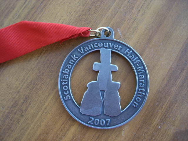 いやあ、道路も洪水状態。思いっきりシューズも濡れ、音をたててしまいそうな勢い。道ばたで声援に立っている人も大変!ジェリコでもあれ上り坂あるし、だんだんなが〜く感じる。カウントダウンして行く方が精神的にも楽になってきた。しっかし、すっごい雨が降っているので、客観的に心の中でだんだん笑えて来た。すっげ〜降っているわぁ。(やっぱり私は雨女?レースでは1回しか晴れたことがない。)何でこの雨の中走ってるんだろうと自問自答したくなってくる。それでも、まだ1時間45分のフィニッシュをイメトレした。だが、だんだん時間がずれて来ているのが分かる。ようやくキツラノ。が、ここで2回目の靴ひもがほどける。普段ではありえな〜い。二重に括っているしぃ。ここで止まって気が付いたけど、体が冷えていて、手もかじかんでいて、思ったように靴ひもを結べず、時間がかかった。気分を切り替えるために、ウォーターステーションでゲートレードをとる。だけど、あまりにも雨が降っているので、別に欲しかった訳でもなく。。。そうこのコースはマラソンのコースを思い出す。特にバラードブリッジは大変だった。。。だけど、その時に比べればまだ足は動く。だけど、筋肉は冷えてきていたみたい。。。ここでクラブであったlululemonで働くSに会う。彼女は元気そうに話しかけてきた。元気?って彼女は2週間前ぐらいにフルマラソン走ったはずと思いながら、頭がまわっていない。頑張ろうとかCome on!って声をかけてくる。気分がここでほぐれてきた。しかも、彼女は声援にもひゅー、ひゅーってこたえる。いや〜、彼女のメンタリティーはすごいね。彼女のお陰で、最後まで走ることができた。フィニッシュラインがもう少し。カーブでいまいち見えない。だけど、ラストスパート。終わったあ。これは本当にSに感謝