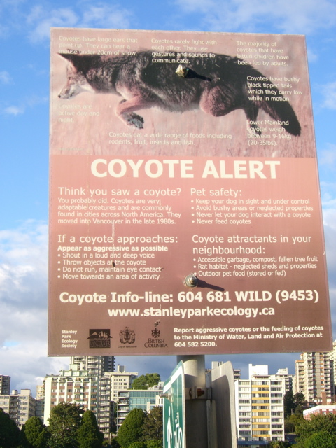 ここにも出るの?と思いましたが。。。見たことありますか?昔UBCのキャンパス内で見ましたよお。その当時はコヨーテなんか見たことがないので、ただの野良犬かあ(野良犬発見したら、ほんとはSPCAに電話しないとね)と思って普通に歩いていたら、他の学生が「コヨーテ!」と言っているのを聞いて、「えっ?あ、本当だ!しっぽが太い。いやあ、どうもイヌしては。。。」と後から思ったんですが。。。それから、VGH、病院の近くでも出現。Wが見かけたらしい。近所じゃんねえ。結構バーナビーとかいろんな所に普通にすんでいるらしい。。。一匹だと普通は問題ないと思いますが、群れでいると危険