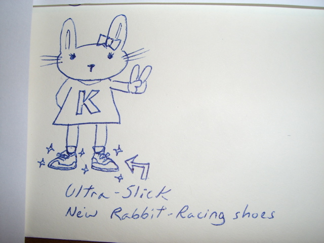 あ、そうそう、一つだけ公開いたしましょう。彼からもらったカードの封筒の表。(彼作)ははは、なんとこれは私です。新しいランニンング・シューズ履いて立っているのってなかなかイケテルでしょ。なぜウサギなのかは聞かないで下さい。