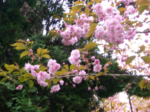やべ〜。と思っていたら、大粒の雨がポツポツと。雨だよ。。。と思っているうちに、チャイナタウンへ。雨はいづこに。チャイナタウンからキャンビーブリッジへ。うわあ、まだまだサンランのウォカーがいっぱい橋を渡っている。そこを横目に私達のテリトリーへ帰って来た。もうちょっと。帰って来たよお。今日は調子がよく、最後の坂を上り、ストアへ!!満足の32キロでした。サンランに参加した友達はどうだったかなあ?と気になる私でした。走った人教えてね。ちょっとぼけた八重桜。。。まだしぶとく咲き始めています。