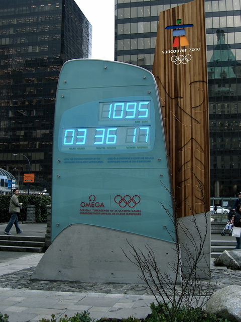 2010年バンクーバーでの冬季オリンピックのカウントダウンの時計がついにアートギャラリーの前に昨日設置された。あと、3年を残すばかり。結構いろんな人が写真を撮っていた!が、ちょっと複雑な気分。この時計って本当に意味があるんだろうか。もちろん宣伝にはなるし、オリンピックに反対をしている訳ではないが、プロテストをしている人の気持ちも分かる。この時計を設置するよりは、ホームレスの人や他のことにお金を使った方がいいと思っているからだ。納税者からというと、確かに税金の無駄遣い?と思いがち。しかし、スカイトレインという電車のラインがオリンピックに向けて増加。この便利さは換えられないとも思ってしまう。しかも、オリンピックまでは失業率も減り、景気は上昇中のはず。だけど、オリンピックの後の施設はどうなるんだろう。しかも、税金が上がるのではという予測?長野のオリッピック後、長野の人はどうしたんだろう。また、どう考えているんだろう。
