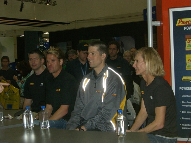 まあ、気を取り直して、次の日はエキスポに行きました。ゼッケンをもらったり、Tシャツをもらったりは、本当にすんなりでした。さすが113回目です。経験はものを語ります。そう、だけど、困ったのは、アディダス。。。オフィシャルのジャケットとかギアを扱っているのは、ここ。いつも来れるとは限らないので、やはり何か買いたいですよね。それが、着替える所は1カ所、2カ所。あり得ないし、長蛇の列が、商品の売っている所まで続く、続く。これで、一気に疲れましたが、そうそう、ウルトラマラソン50キロで、アメリカ新記録を出した彼。(名前が出て来ませんが、トークしてました。左から2番目)やはりコースを見ようと思い、大きなスクリーンで、ボストンのコースを解説付きで見せてました。見た後は、いや〜どうしよう、坂でやばいよ〜